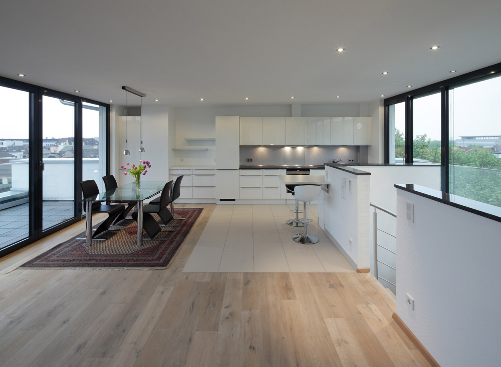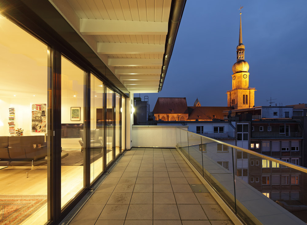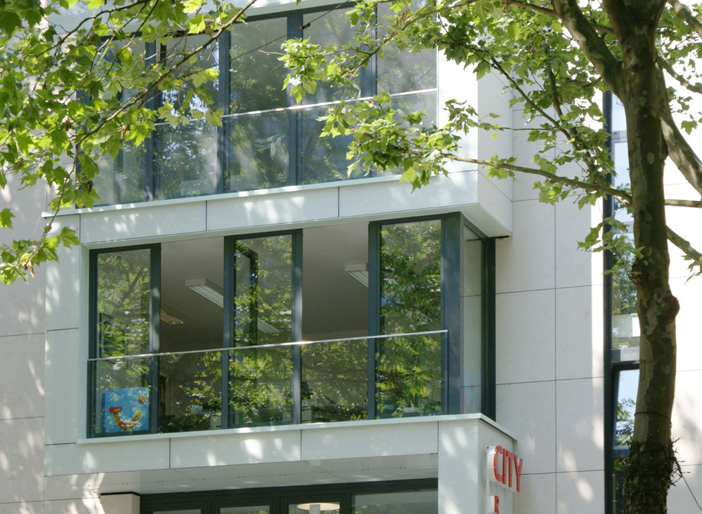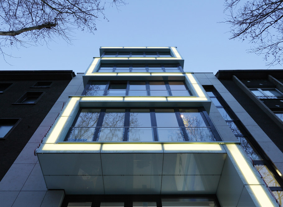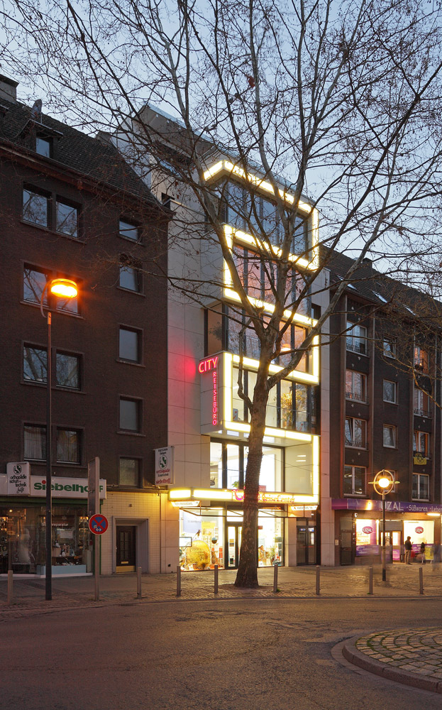 Der Neubau eines Wohn- und Geschäftshauses in einer innerstädtischen Baulücke wurde als selbstbewusster Baukörper mit werbewirksamer Signalwirkung konzipiert. Ein weithin sichtbares gläsernes Lichtband in Form eines Mäanders akzentuiert und strukturiert die Fassade. Aufgabe war, einen publikumswirksam gestalteten zweigeschossigen Kunden- und Verwaltungsbereich für ein Reisebüro sowie drei anspruchsvolle Wohnungen mit gehobener Ausstattung in den Obergeschossen zu schaffen. Großzügig verglaste Erker und Terrassen gestatten großartige Ausblicke über die Dortmunder Innenstadt.