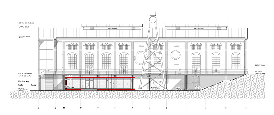 Der Investor beabsichtigt, die historische Phoenixhalle auf dem Phoenix West Areal in Dortmund zu einer Veranstaltungshalle umzubauen. Zukünftig werden hier Konzerte für bis zu 3.700 Besucher stattfinden. Im Kellergeschoss und einem seitlich geplanten Neubau ist ein Club geplant. Die Wahrung des äußeren historischen Charakters war eine der Kernaufgaben des architektonischen Konzepts.