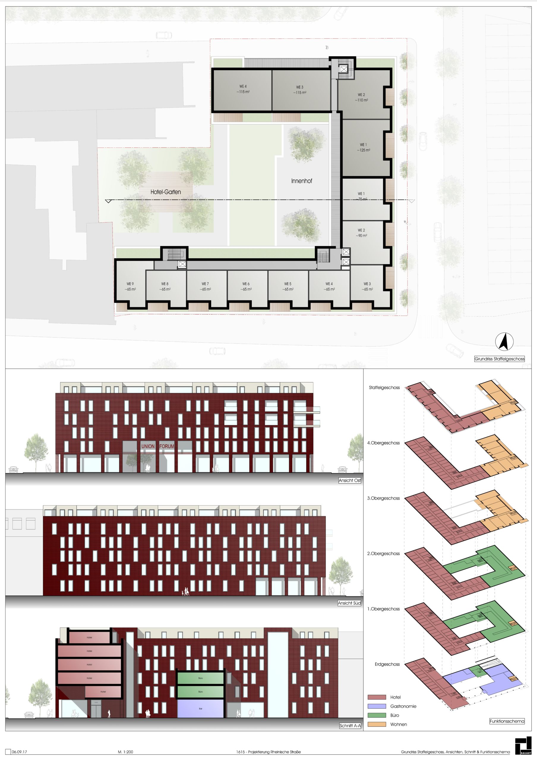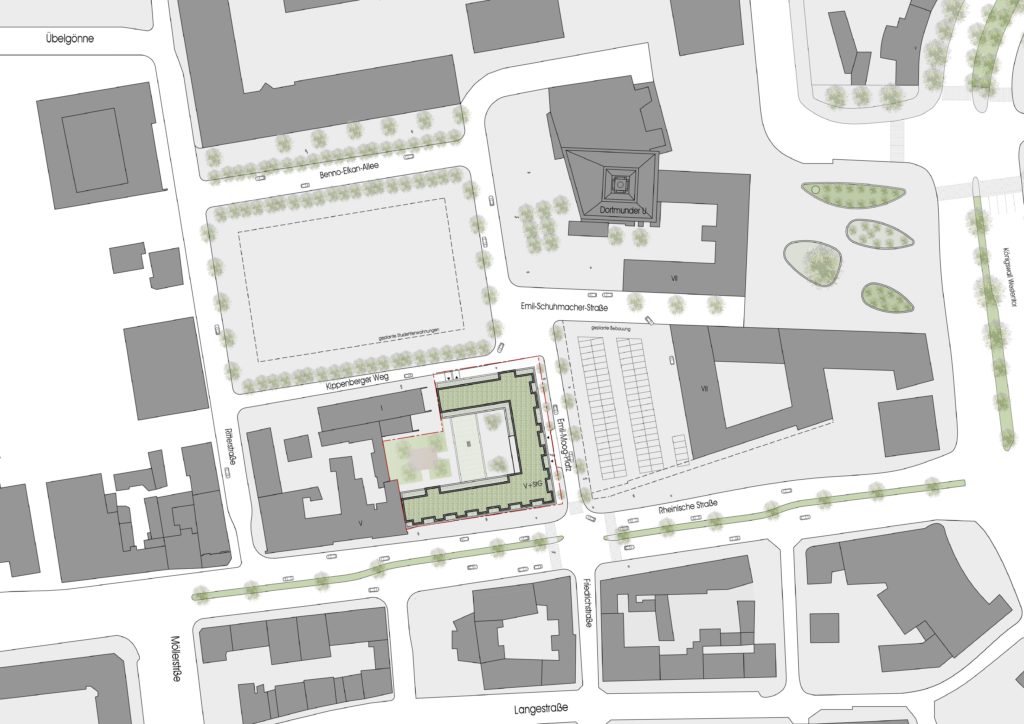 Das U-förmige, fünfgeschossige Gebäude mit zurückgesetztem Staffelgeschoss bildet die städtebauliche Kante entlang der Rheinischen Straße und dem Emil-Moog-Platz. Im großzügigen Innenhofbereich ist ein dreigeschossiger Gebäudeteil eingesetzt, welcher einen öffentlichen und privaten Innenhof voneinander trennt. Dieser öffentliche Hof – als zentraler Zugang für die öffentlichen Nutzungen im Gebäude – wird über einen großzügigen Eingangsbereich vom Emil-Moog-Platz erschlossen.